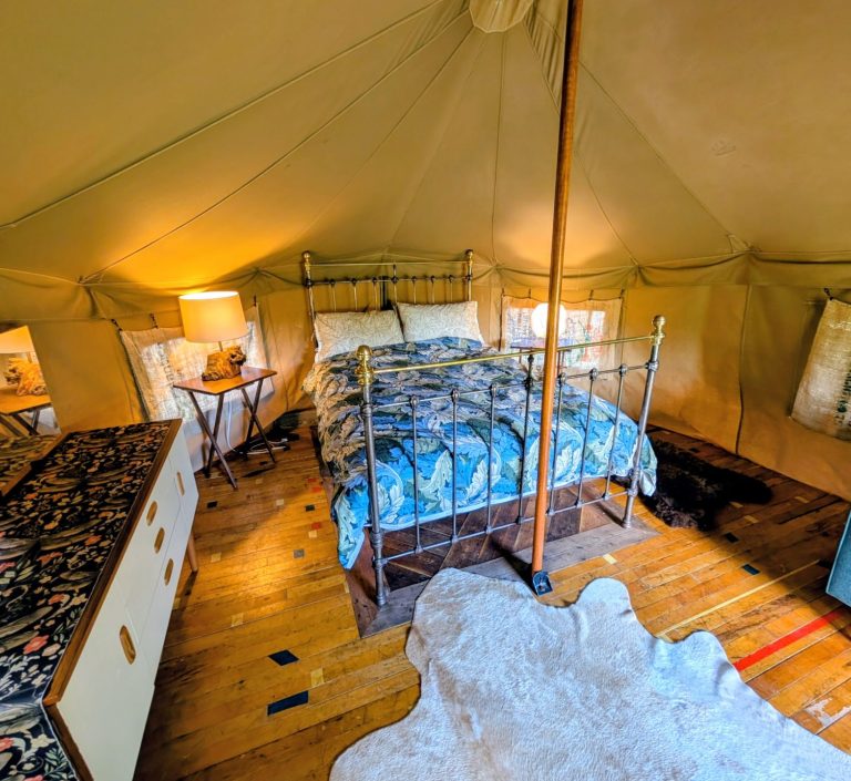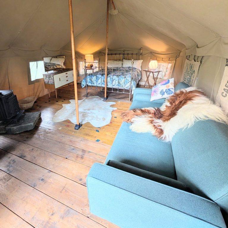Our cozy safari tent is perfect for those wanting a little more comfort while making family core memories. The reclaimed wooden floor & retro furnishings add to it's rustic charm, while the wood burning stove & local sheepskins will keep you warm, while you plan your next trip or play a game, should the weather turn out to be a bit, well, British!
