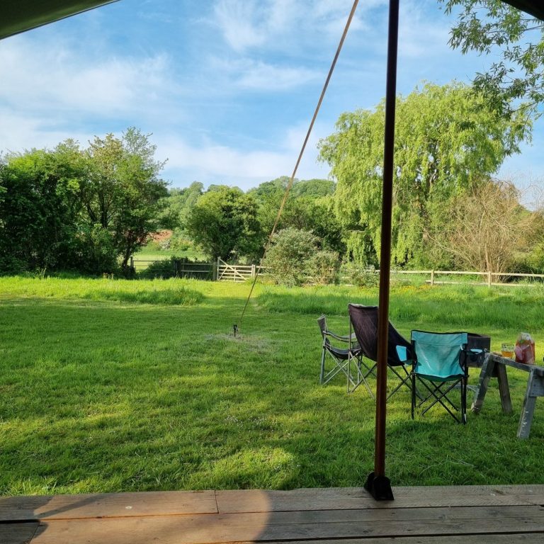 Nestled between two ancient Somerset Willow, South facing, with an uninterrupted view toward our field gate & the public footpath beyond. The rest of the campsite litterally revolves around you! From the deck, you can sit with your morning coffee & soak it all in as the countryside comes to life, you may even see the local deer that often visit us.